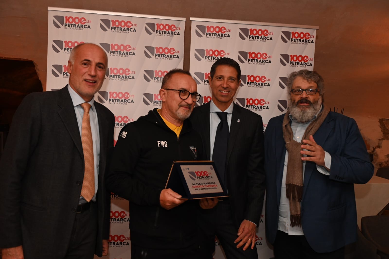 L’occasione è stata sfruttata dal presidente Morlino per consegnare una serie di targhe a quei personaggi che sono entrati di diritto nella storia del club per la loro “anzianità” sia societaria che tecnica. Sono stati così premiati Niccolò Bottin per le 312 gare di campionato giocate in maglia bianconera; Daniele Turiaco, miglior realizzatore in campionato con 99 reti; il dottor Paolo Garufi, medico sociale con più presenze al servizio della prima squadra, così come il team manager Lorenzo Carrossa nella qualifica di dirigente accompagnatore ufficiale. Ma non solo: un premio è andato anche a Paolo Mingatti per le 16 stagioni disputate col Petrarca (quelle dal 1995 al 2000, dal 2005 al 2009 e dal 2015 al 2022) ed applaudissimo è stato anche mister Luca Giampaolo, trainer dell’exploit patavino in campo nazionale, arrivato a sommare ben 193 panchine tra il 2017 e il 2023 e di fatto l’allenatore con il maggior numero di presenze alla guida della prima squadra.