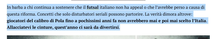 Quindi, se Cardinal e Pola hanno scelto di venire in Italia nella convinzione che il futsal della nostra Penisola fosse il nuovo avamposto della disciplina a livello internazionale, lo hanno fatto - secondo costui - perchè il nostro futsal, grazie alla riforma, ha acquisito (o meglio, riacquisito) quel grande appeal tale da convincere due assi della scena europea - uno dei quali, Cardinal, possiamo anche dire vicino ai suoi primi 40 anni - a scegliere l’Italia per arricchire le rispettive carriere.