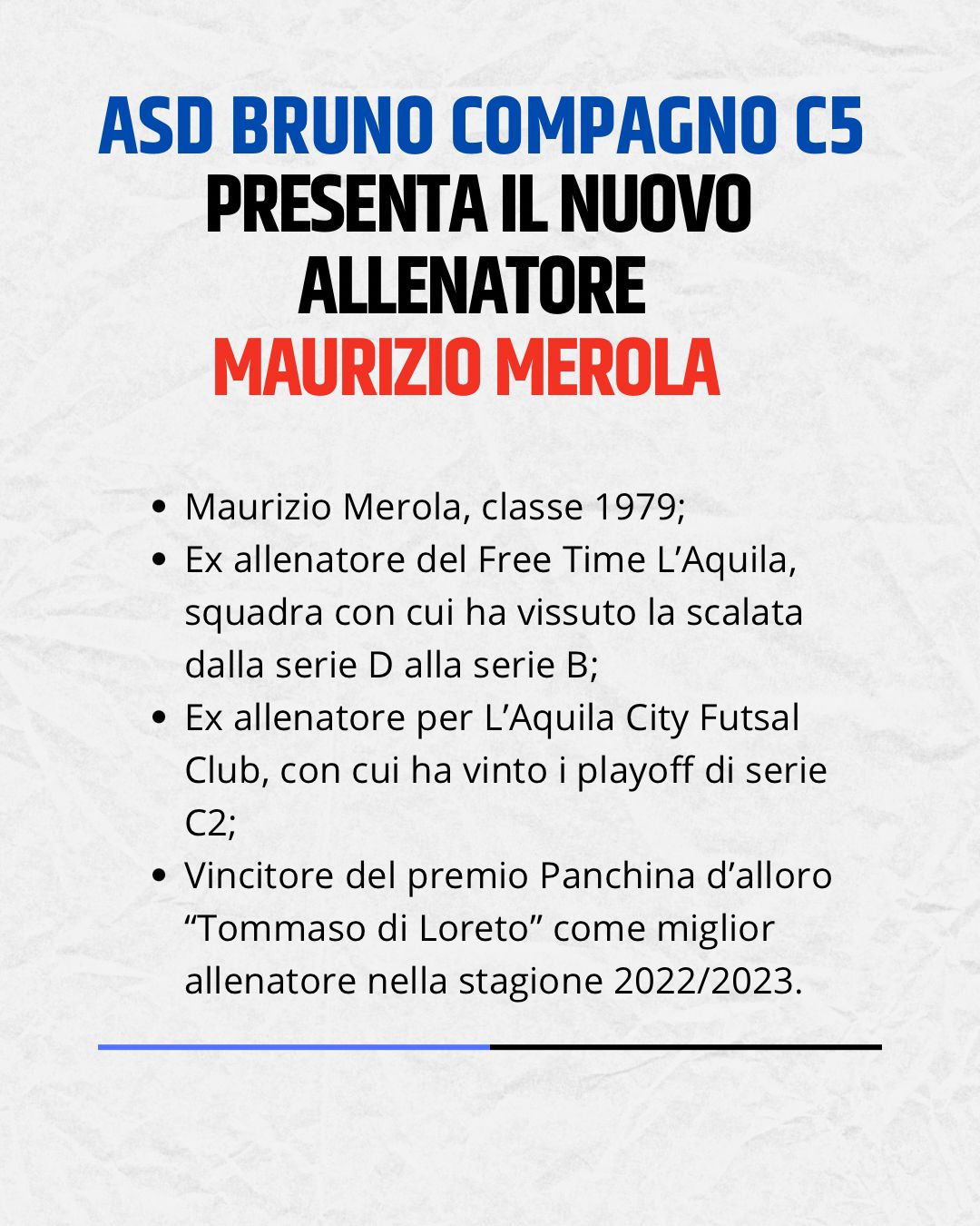 Colpo da 90 per la panchina della ASD Brino Compagno Avezzano C5 militante nella serie C2 A abruzzese. In panchina è ufficiale l'arrivo di Maurizio Merola classe 1979 (in foto) ex tecnico della Free Time l'Aquila. Al suo fianco ci sarà il preparatore dei portieri e vice allenatore Alessandro Ianni, classe 1988. La società augura buon lavoro ai mister.