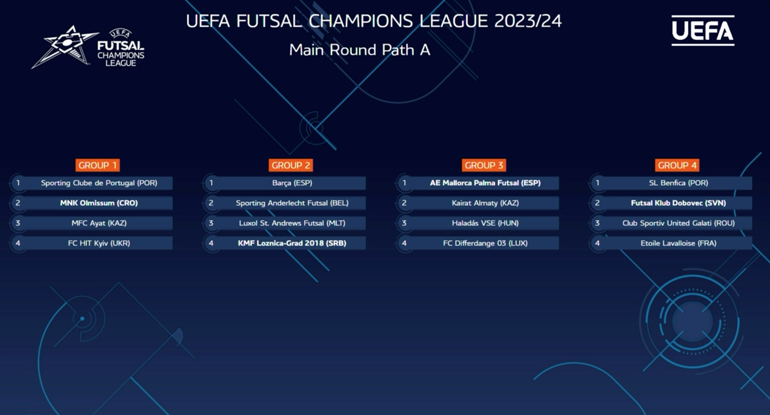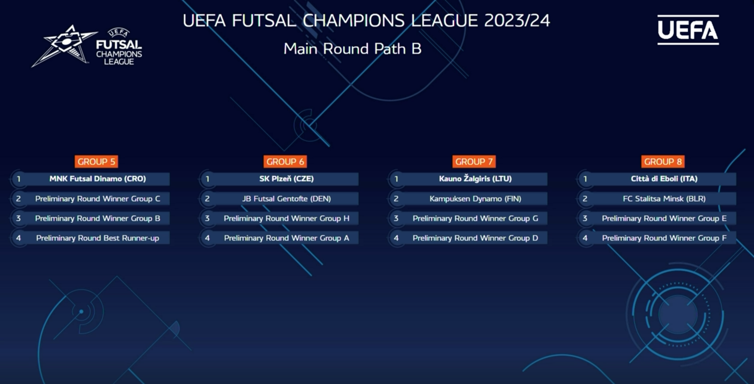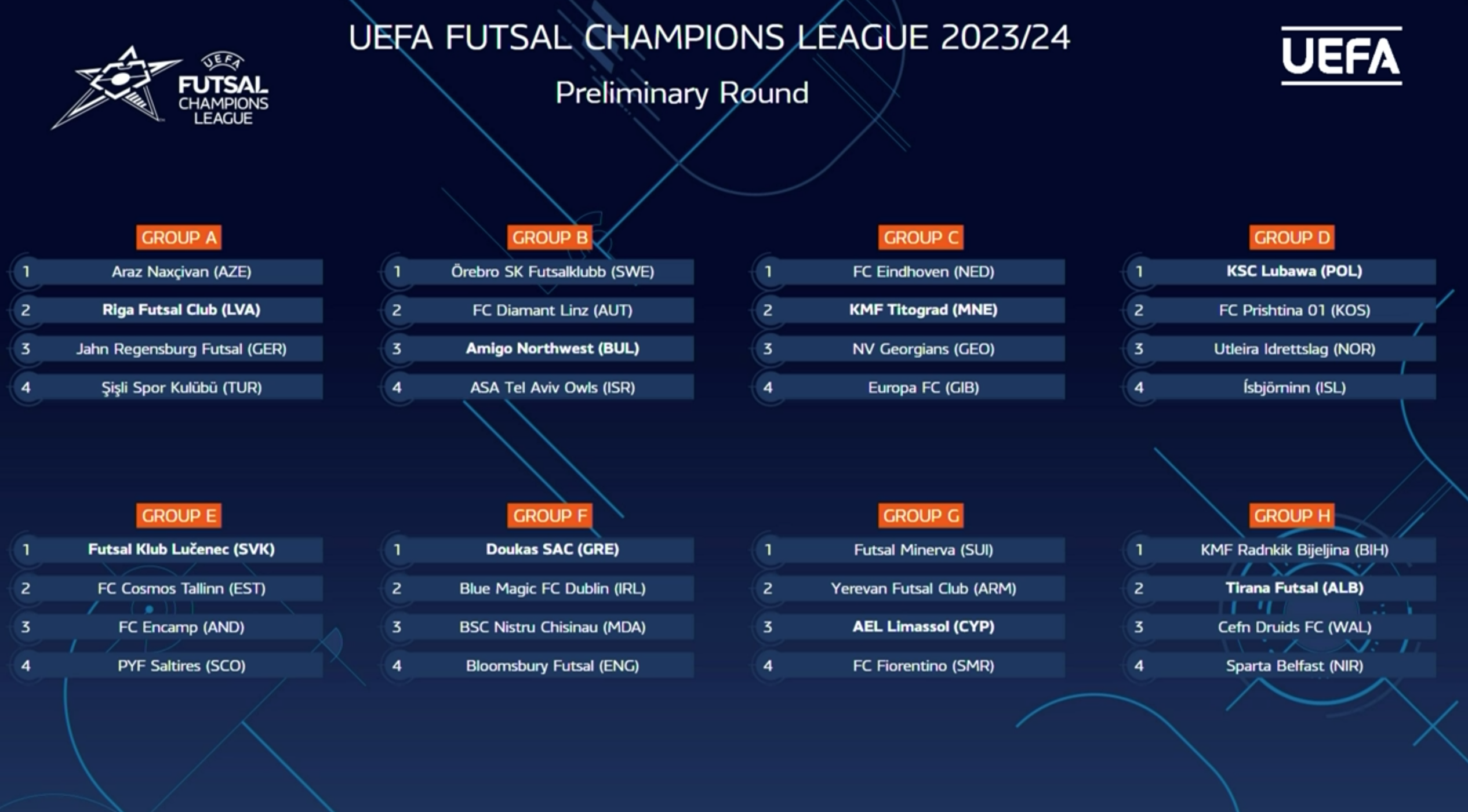 Nel gruppo E, che sarà ospitato dai campioni slovacchi del Lucenec, sono stati inseriti gli estoni del Cosmos Tallinn, gli andorrani dell’Encamp e gli scozzesi del PYF Saltires; nell’F, in programma ad Atene, contenderanno il passaggio del turno al Doukas campione ellenico e padrone di casa gli irlandesi del Blue Magic Dublino, i moldavi del Nistru Chisinau e gli inglesi del Bloomsbury Futsal. I gironi del Preliminary Round si disputeranno dal 22 al 27 agosto.