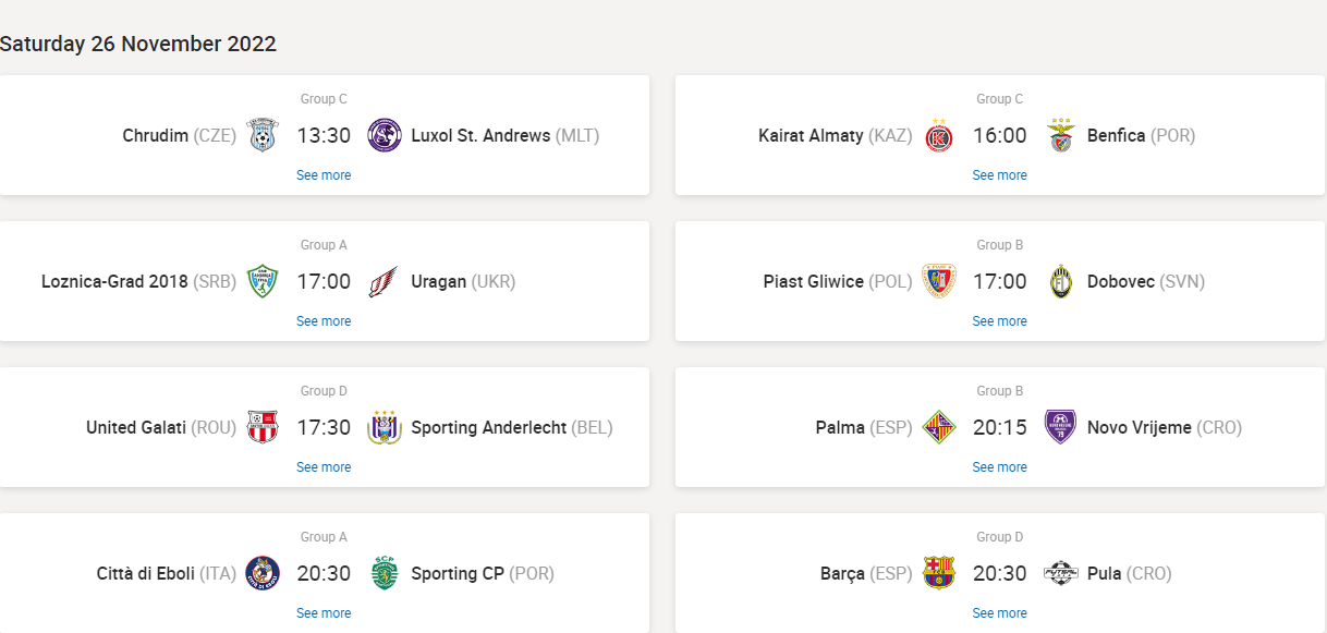 GIRONE C - La sfida col Benfica rappresenta l'ultima occasione per il Kairat Almaty (fermo ad un punto) per poter dare un senso ad un Elite Round fin qui deludente per i campioni del Kazakistan. Il Benfica dal canto suo deve vincere e in caso di vittoria partirebbe in vantaggio nella corsa alla qualificazione per una differenza reti al momento migliore rispetto ai cechi del Chrudim i quali, però, hanno sulla carta l'impegno meno disagevole contro i maltesi del Luxol. Situazione ancora aperta quindi, con il Chrudim che non dispera di approdare clamorosamente alle finali di maggio .