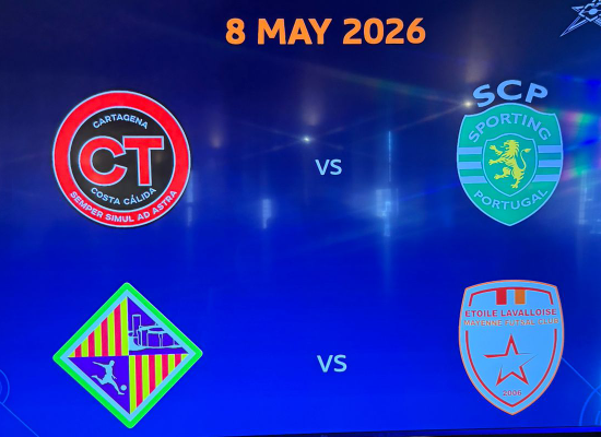 IL SORTEGGIO. Svolto questa mattina presso la Sala Metaurense della Prefettura di Pesaro e Urbino, la cerimonia del sorteggio, a cui ha partecipato Stefano Mammarella in qualità di ambassador della competizione (era il portiere del Montesilvano che nel 2011 vinse la competizione, unico club italiano della storia a riuscire nell'impresa), ha visto Cartagena e Sporting (con sfida tutta italiana fra Gabriel Motta e Alex Merlim) accoppiate nella prima semifinale dell’8 maggio alle ore 17.30, mentre Palma ed Etoile Lavalloise si affronteranno nella seconda partita (ore 20.30) che spalanca le porte alla finale del 10 maggio delle ore 18 (alle 15 la finale per il 3° posto). L’ordine delle semifinali sarà decretato successivamente in relazione alle esigenze televisive (gli orari saranno 17.30 e 20.30).