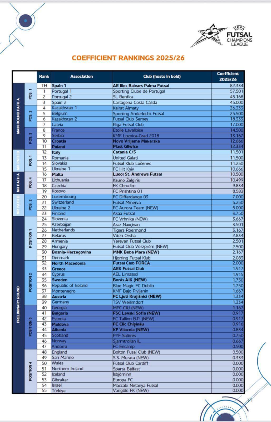 Le quattro federazioni meglio classificate nel ranking UEFA per coefficiente (GUARDA QUI IL RANKING PER NAZIONI) iscriveranno due rappresentanti (Portogallo, Spagna, Kazakistan e Ucraina), con un club a testa per le altre nazioni, Italia compresa che sarà rappresentata dalla Meta Catania che partirà direttamente dal Main Round (12° posto nel ranking per i siciliani).