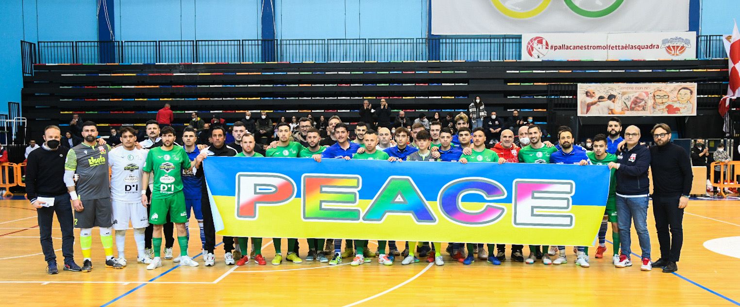 Un lungo striscione con scritto "Peace" (in galleria) ha accompagnato al centro del campo Aquile Molfetta e Giovinazzo nel recupero della sedicesima giornata del campionato di A2, girone D. Al Palapoli di Molfetta le due squadre debbono fare a meno di pedine importanti: Zurdo e Koseky tra i padroni di casa, mentre Menini è assente tra gli ospiti. Il derby (bellissimo) va al Giovinazzo che vince per 4-3 grazie ad una condotta di gara intelligente e cinica, ma onore al Molfetta che ha giocato un grande match e che sicuramente avrebbe meritato sorte migliore.