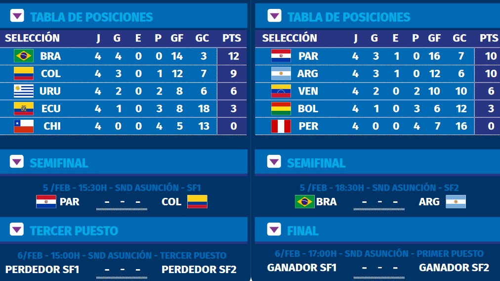 Il Paraguay ha chiuso con 10 punti il gruppo B al pari dell’Argentina e per la migliore differenza reti passa come prima e sfiderà la Colombia giunta seconda nel girone A. Per l’Albiceleste sfida da brivido invece con il Brasile giunto primo nell’altro raggruppamento. Una delle due big del futsal sudamericano perderà la finalissima, mentre per i padroni di casa del Paraguay si apre una ghiotta opportunità se dovesse arrivare la vittoria contro la Colombia.