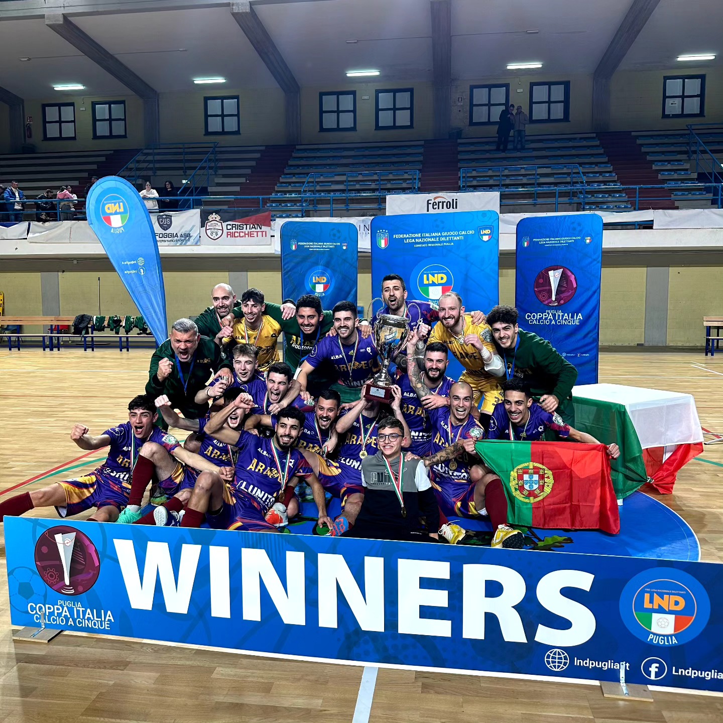L’Aradeo ha alzato al cielo la Coppa Italia di calcio a 5 riservata alle formazioni della serie C/1 pugliese In foto di galleria). La squadra guidata in panchina da mister Di Serio ha battuto nella finale il C.U.S. Foggia con il punteggio di 3-2 in una finale molto tirata giocata al Palasport di Mola di Bari.