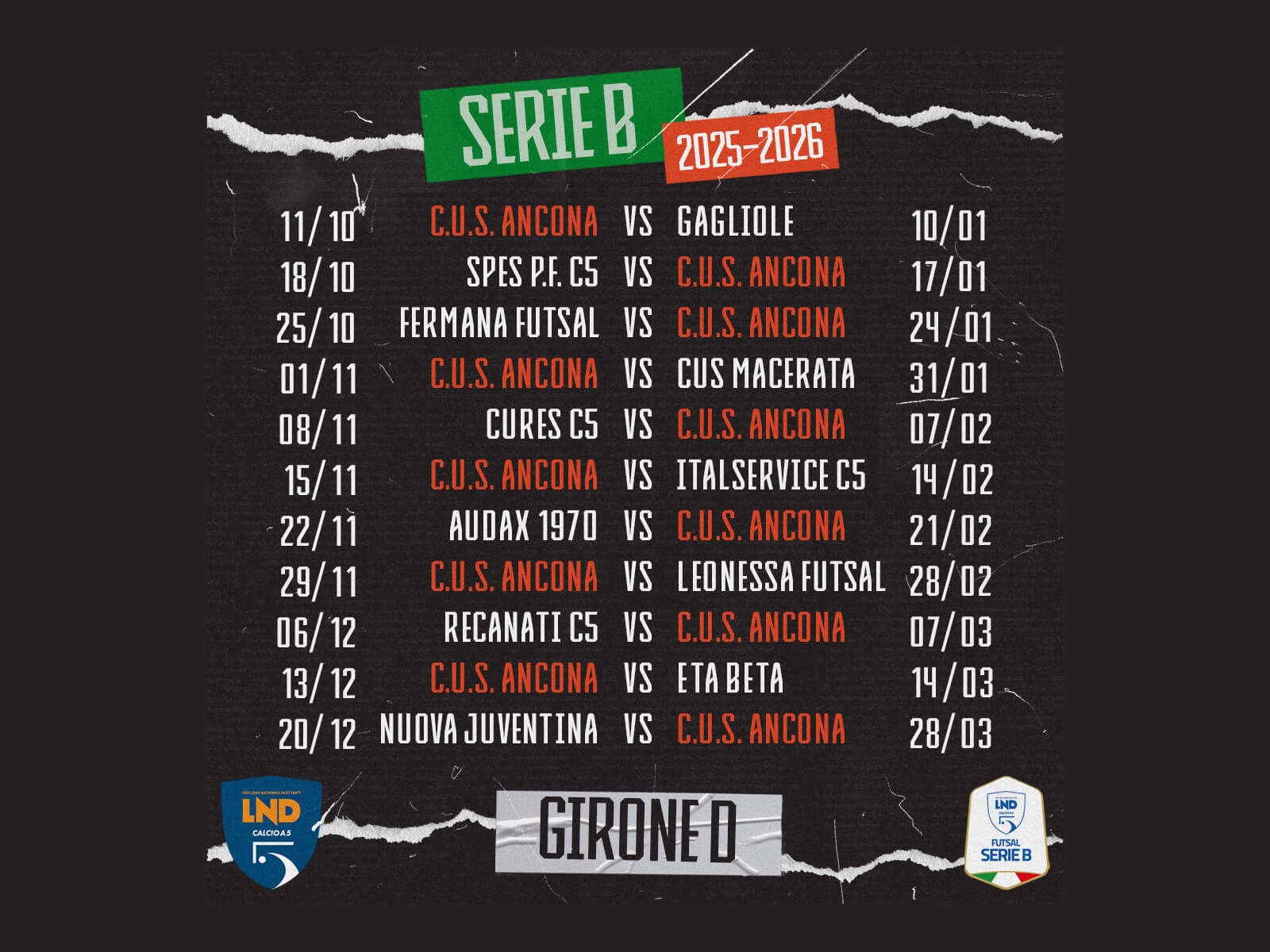 Dopo l’esordio casalingo, il calendario riserva due trasferte consecutive, la prima in provincia di Rieti, a Poggio Fidoni, contro lo Spes C5, la seconda a Fermo, per affrontare la Fermana Futsal. La quarta giornata segna il ritorno al PalaCus per un derby molto atteso contro il CUS Macerata, mentre nella quinta si volerà nuovamente nel Lazio per sfidare il Cures C5, alle porte di Roma.