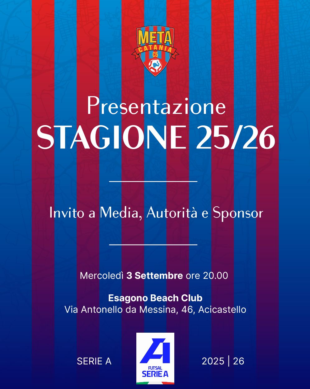 Un evento di grande prestigio dove verrà presentata alla stampa la Meta Catania 2025/2026, squadra Campione d’Italia, pronta a difendere il tricolore con ambizione e determinazione e pronta per la grande avventura della Uefa Futsal Champions League.