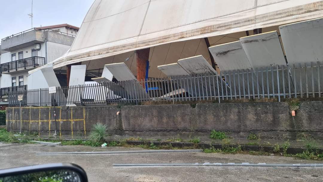 Brutte notizie per il Città di Melilli. La tecnostruttura di Villasmundo, che ospita le gare casalinghe del campionato di Serie A della formazione iblea ha subito importanti danni a causa del maltempo che si è abbattuto sulla costa orientale della Sicilia nelle ultime ore. Il vento, come si può vedere dalla foto di copertina, ha divelto i pannelli che compongono il rivestimento laterale del PalaVillasmundo e di conseguenza la pioggia battente è entrata all’interno della struttura allagando il campo di gioco.