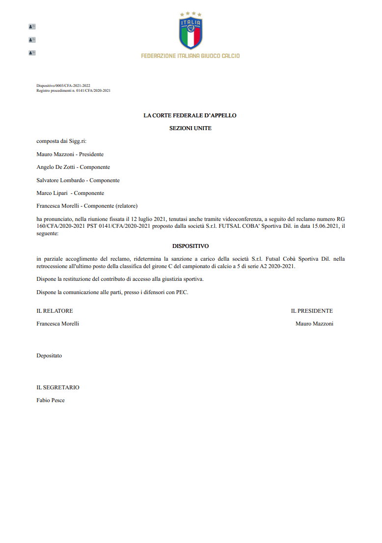Con il Comunicato Ufficiale numero 6, la Divisione Calcio a 5 ha reso nota la sentenza della Corte Federale d’Appello riunitasi quest’oggi (LEGGI QUI oppure VEDI NELLA GALLERY), relativamente all’esclusione del Futsal Cobà dal campionato di A2. La decisione era stata assunta lo scorso 31 maggio dal Tribunale Federale Nazionale in seguito all'accoglimento del deferimento del club marchigiano proposto dalla Procura Federale (LEGGI QUI IL NOSTRO SERVIZIO)