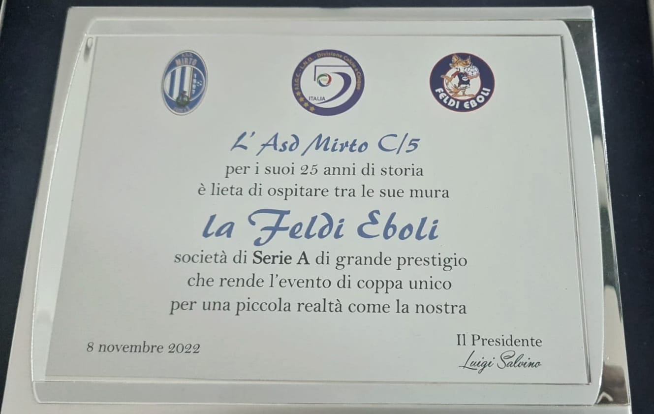 Grande attesa in Calabria per l'arrivo della Feldi Eboli, accolta da un pubblico molto caloroso. Non solo, le volpi sono state omaggiate dalla società di casa con una targa: infatti, il Mirto C5 quest'anno festeggia i suoi 25 anni di storia e il presidente dei calabresi, Luigi Salvino, ci ha tenuto ad offrire un riconoscimento alla società ebolitana che con la sua presenza in Calabria ha reso indimenticabile questa annata per tutti i tifosi di una realtà come quella del Mirto.