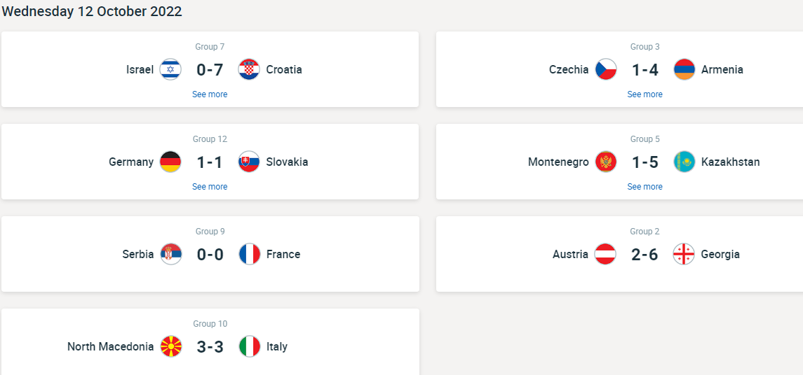 Per Georgia e Kazakistan contro Austria e Montenegro due affermazioni entrambe autorevoli e convincenti. Buon pari a reti inviolate della Francia a Sabac contro la Serbia (gruppo 9). Pari per 1-1 pure tra Germania e Slovacchia nel girone 12.