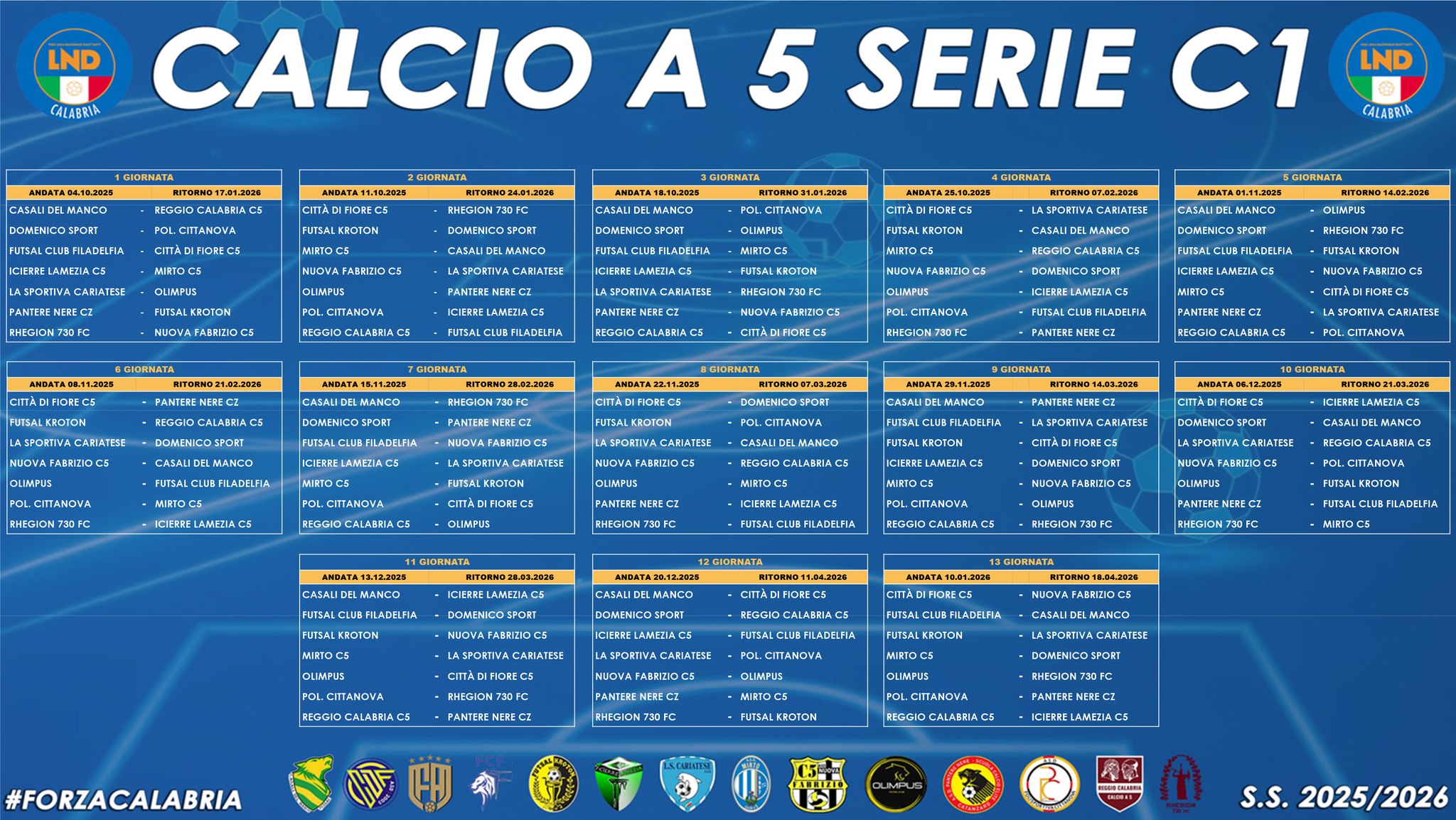 Secondo calendario il cammino dei coriglianesi inizierà fuori casa alle ore 18:30 sul campo del Reghion (and. 04.10.25 rit. 17.01.26 ore 15). Seconda giornata alle 15 sul suolo amico derby contro la Sportiva Cariatese (and. 11.10.25 - rit. 24.01.26 ore 15), terza in trasferta a Catanzaro contro le Pantere Nere alle 15 (and. 18.10.25 - rit. 31.01.26 ore 15), la quarta in casa alle 15 contro la Domenico Sport (and. 25.10.25 - rit. 07.02.26 ore 15), la quinta fuori casa contro il Lamezia alle 16:30 (and. 01.11.25 – rit. 14.02.26 ore 15), alla sesta la N. Fabrizio ospiterà alle 15 il Casali del Manco (and. 08.11.25 – rit. 21.02.26 ore 16), alla settima di scena sul campo del Filadelfia alle 16 (and. 15.11.25 – rit. 28.02.26 alle 15), ottava alle 15 sfida casalinga contro il Reggio Calabria (and. 22.11.25 – rit. 07.03.26 alle 15), al nono turno altro derby ma fuori casa contro il Mirto Crosia (and. 29.11.25 - rit. 14.03.26 alle 15), alla decima match interno contro la Polisportiva Cittanova (and. 06.12.25 - rit. 21.03.26 alle 15), all’undicesima in esterna contro il Kroton alle 15 (and. 13.12.25– rit. 28.03.26 alle 15), alla dodicesima sul suolo amico alle 15 contro l’Olimpus (and. 20.12.25 – rit. 11.04.26 alle 15) e alla tredicesima in trasferta alle 17 contro il Città di Fiore (and. 10.01.25 – rit. 18.04.26 alle 15).