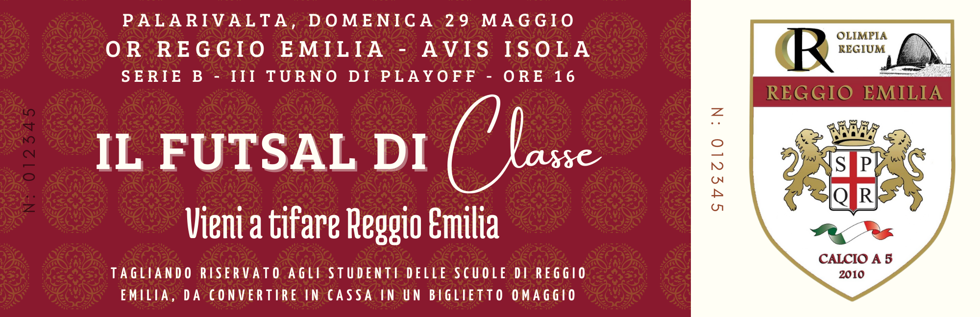 L’OR Reggio Emilia lancia il progetto “Il futsal di classe”. In occasione della gara valida per il terzo turno dei playoff di Serie B, in programma domenica alle 16 a Rivalta contro gli astigiani dell’Avis Isola Calcio a 5, la società cittadina ha chiamato a raccolta gli studenti delle scuole medie e superiori di Reggio Emilia e provincia, offrendo loro tramite l’Ufficio Educazione Fisica dell’Ufficio Scolastico Territoriale (UST) un ticket da presentare alla cassa che permetterà l’ingresso omaggio all’impianto. Si tratta dell’ennesima iniziativa che lega la società cittadina al territorio reggiano e al sociale: un percorso iniziato già un anno fa quando i granata furono organizzatori e promotori de “Lo sport reggiano si fa con il CORE” a favore di Grade Onlus.