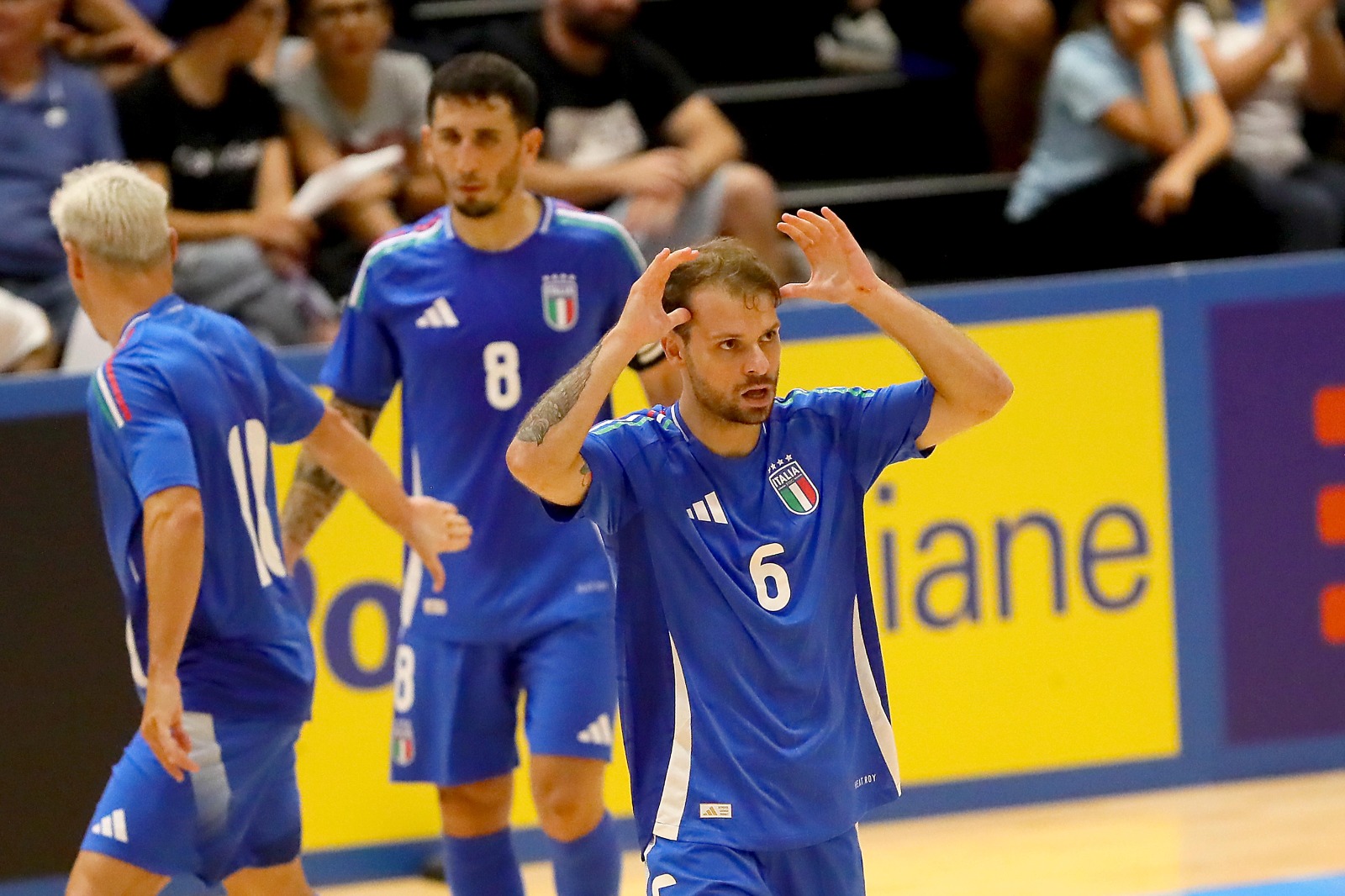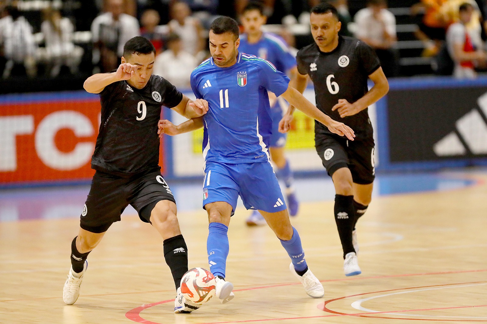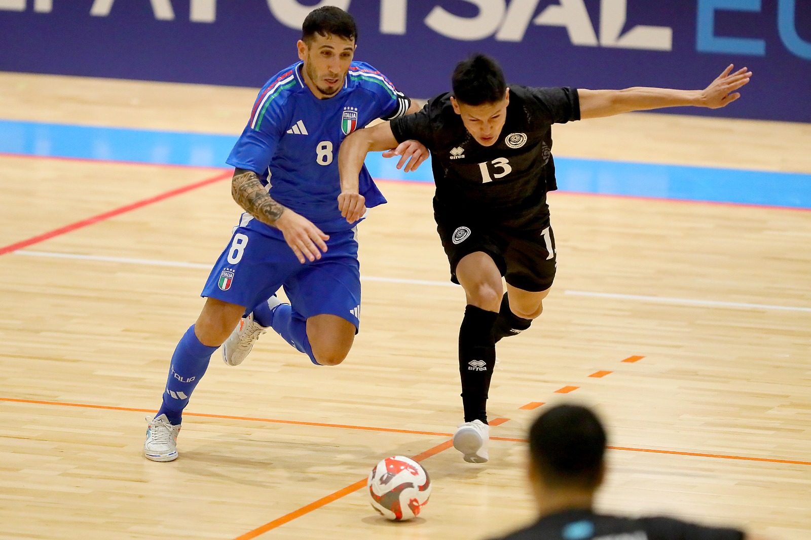 LA CRONACA - Palla al centro e in campo si vola letteralmente, con il Kazakhstan che attacca da subito. La prima azione è di Edson dopo 1’10”, sinistro alto; il numero 6 kazako ci riprova trenta secondi dopo ma Bellobuono è sicuro nella presa. Al 4’14” ancora Edson ruba palla a Rossetti, scambia con Knaub e spara a un nulla dall’angolo alto alla sinistra di Bellobuono. L’Italia si fa vedere con Rossetti al 6’28”, ma il pivot del Sala, contrastato, non riesce a colpire bene e Higuita controlla; sul fronte opposto Bellobuono vola sulla botta del solito Edson.
