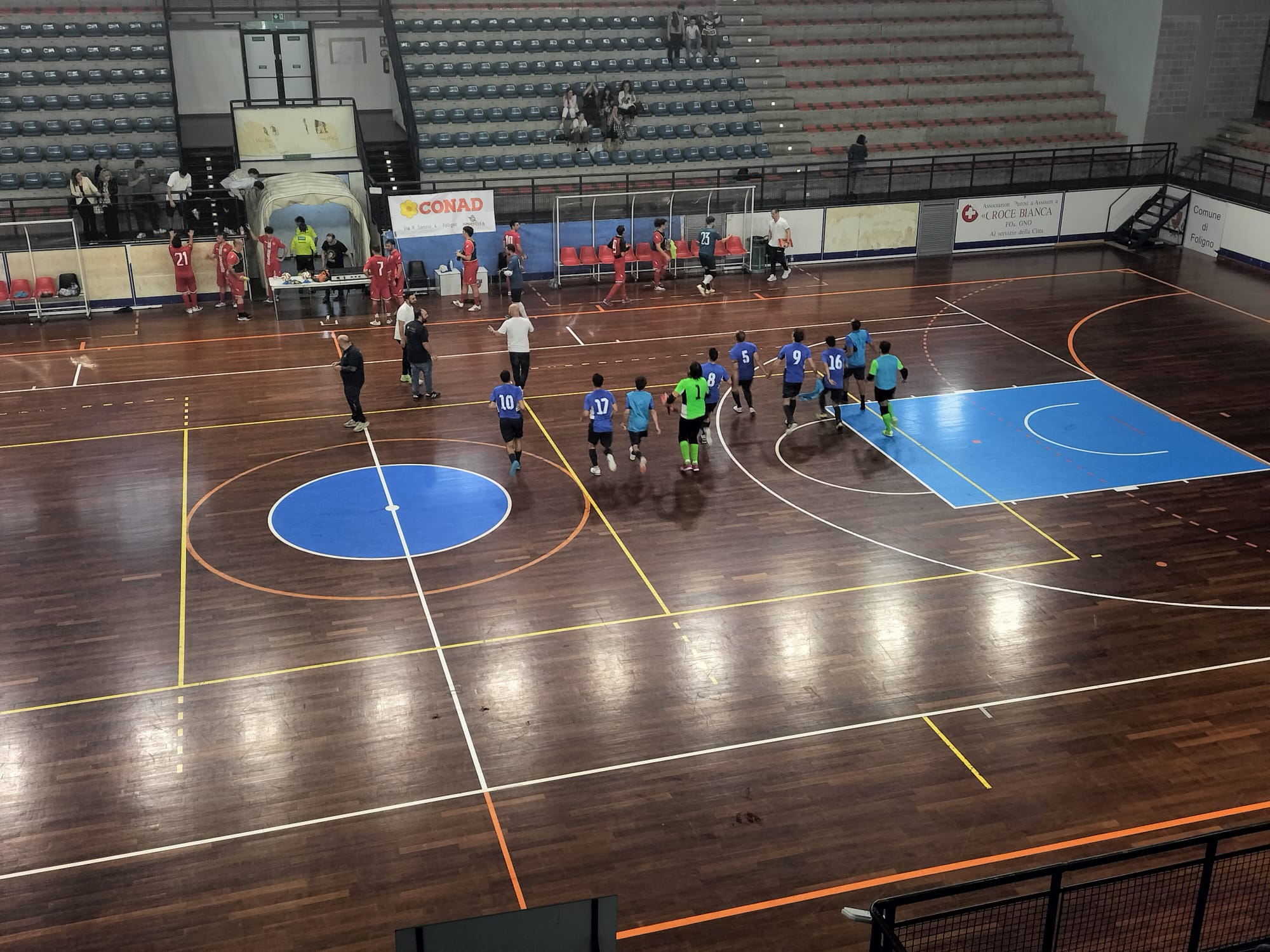 L’Umbrasabina, alla ripresa, rientra con tutt’altro spirito attaccando molto, anche grazie all’utilizzo del quinto di movimento, e arrivando spesso a impensierire la porta folignate difesa da Mercuri. È però proprio da un’azione degli ospiti, termina con un palo, che si innesca la ripartenza del 6-1; straripante Crescimbeni che si fa tutto il campo e serve a Andrea Farnesi una palla da appoggiare solo in rete, arriva dunque anche la tripletta (35’). Mette la firma anche di Fiore quasi con un passaggio nella porta sguarnita degli ospiti che stavano provando ad accorciare con il quinto di movimento (53’). La stanchezza si fa sentire e l’Umbrasabina negli ultimi cinque minuti riesce con la doppietta di Alessio Matticari e il gol di Monesi ad accorciare il divario.