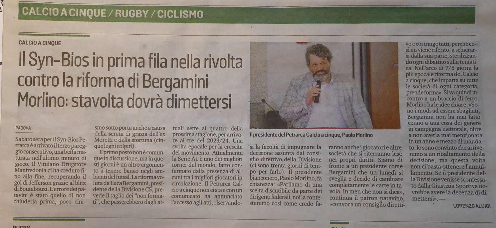 Come si ricorderà, nei giorni scorsi Morlino aveva avanzato una richiesta ufficiale per accedere agli atti votati dal Consiglio Direttivo, deciso a intraprendere l’iter, anche legale, per bloccare questo processo che minerebbe pericolosamente la competitività del massimo campionato impoverendo di conseguenza non solo la Serie A ma anche le altre categorie nazionali. Morlino, per dirla tutta, starebbe montando la sua personale battaglia nei confronti della Divisione Calcio a 5: è quello che si interpreta dalle note stampa comparse nella giornata odierna sulle principali testate padovane, cartacee e web, in cui il patron petrarchino, a caratteri cubitali, “invita” il presidente Bergamini a dimettersi.
