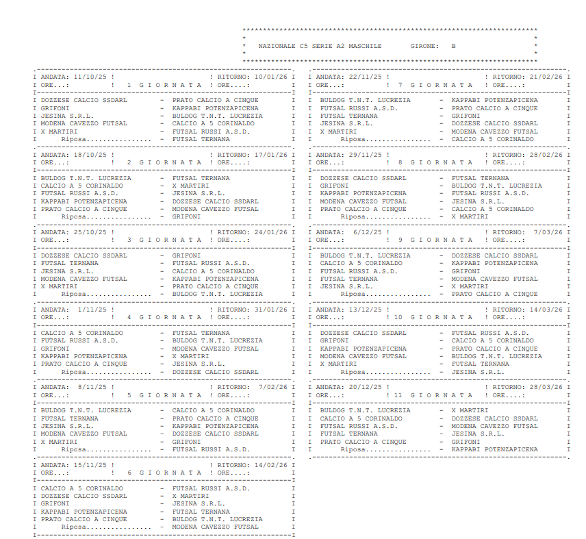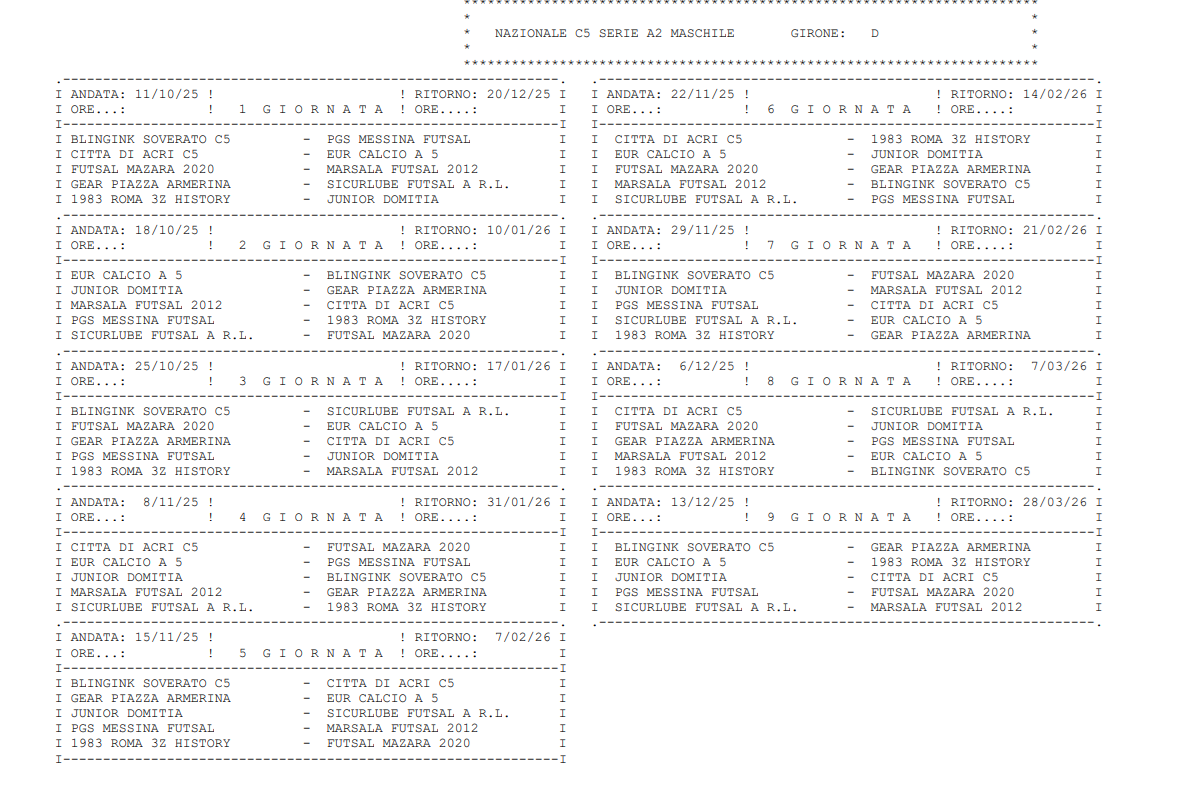 Con il comunicato ufficiale n.12, la Divisione Calcio a 5 ha formalizzato il calendario della Serie A2 2025-2026. Si parte l’11 ottobre, mentre la linea del traguardo è fissata al 28 marzo. Come annunciato nel c.u. n.11, il girone D è stato rimodulato a 10 squadre, con la Roma Calcio a 5 inserita nel girone E di Serie B.