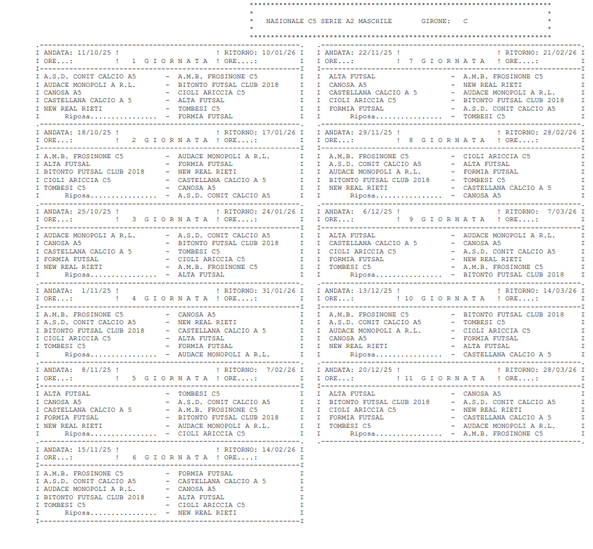 Nel girone C è subito derby laziale con Cisterna-AMB Frosinone. Il Bitonto viaggerà alla volta di Monopoli per un derby pugliese che dovrà affrontare anche l’Alta Futsal lontano da casa con il Castellana. Il Formia invece dovrà stare fermo ai box per la giornata di riposo.