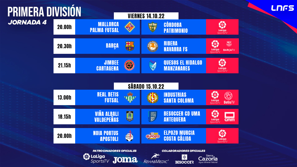 La quarta giornata inizierà già questo venerdì alle ore 20 in Primera Division con lo scontro tra Mallorca Palma e il Córdoba Patrimonio, in diretta ed esclusiva su LaLigaSportsTV. Una partita questa in cui i locali vogliono conquistare una vittoria che permetta loro di imporsi nella zona nobile della classifica, contro un avversario che dal canto suo cerca il suo primo successo stagionale. Sempre venerdì alle 20,30 tocca alla capolista Barça contro il Ribera Navarra e poi al Jimbee Cartagena contro il sempre più lanciato Manzanares.