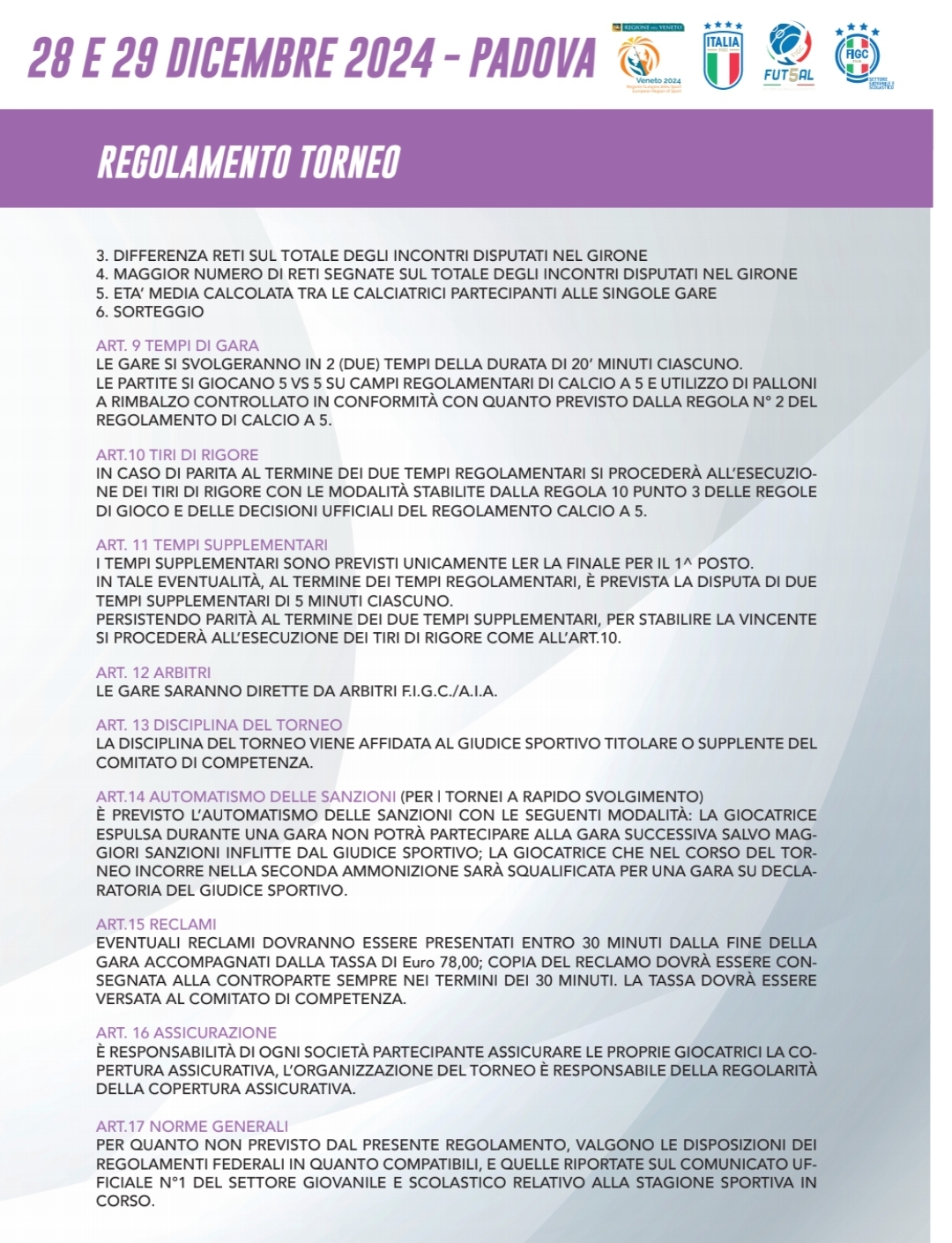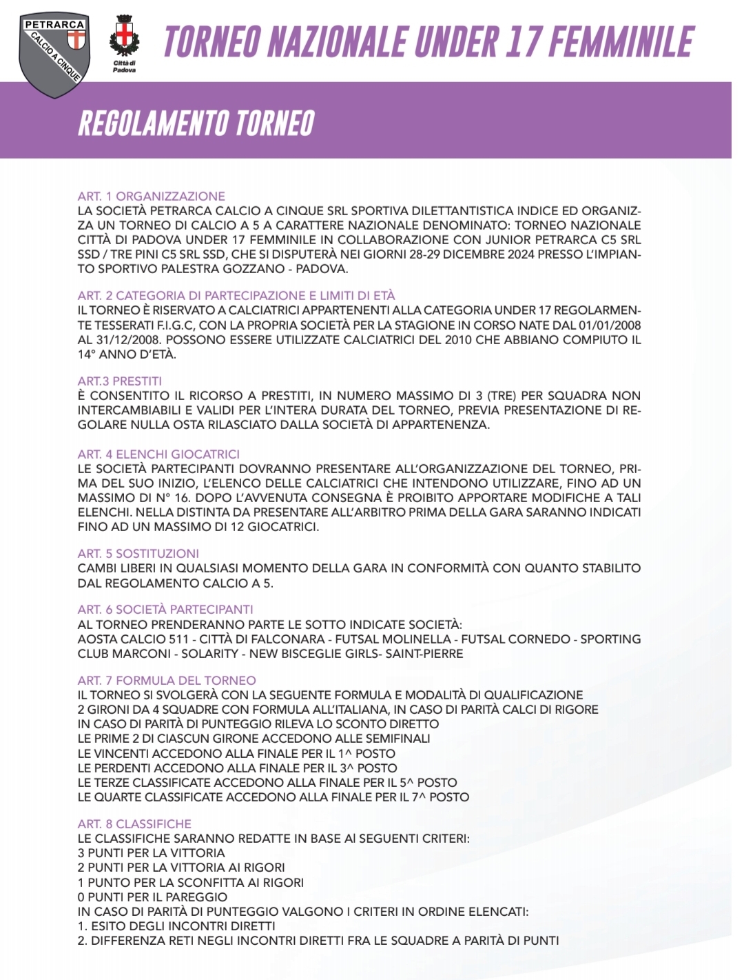 Il Torneo Nazionale “Città di Padova” Udner 17 femminile parte oggi per la sua prima storica edizione (LEGGI QUI), la due-giorni di futsal organizzata dal Vinumitaly Petrarca con il patrocinio del Settore Giovanile Scolastico della FIGC. Il torneo è riservato alle giocatrici nate tra il 1° gennaio 2008 al 31 dicembre 2009, oltre alle atlete nate nel 2010 che abbiano già compiuto il 14° anno d'età (regolamento completo in gallery).